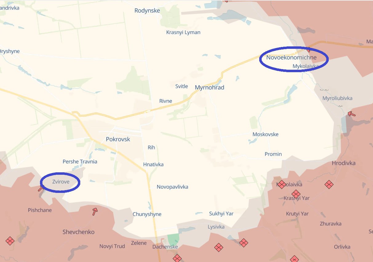 На Покровському напрямку міноборони РФ заявляє про захоплення російською армією Новоекономічного та Звєрєвого. Новоекономічне знаходиться на східних підступах до Мирнограду, а Звєрєво на південний захід від Покровська.