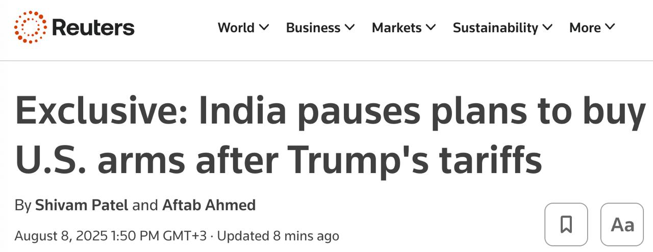 За їхніми даними, Нью-Делі планував найближчими тижнями відправити до США міністра оборони Раджнатха Сінгха для оголошення про деякі закупівлі, але ця поїздка була скасована. Йдеться про покупку шести розвідувальних літаків Boeing P8I, бойових машин Stryker та протитанкових ракет Javelin.