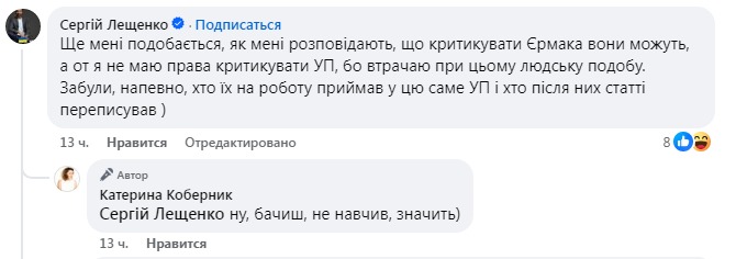 Позже он добавил, что журналисты "Украинской правды" "рассказывают, что критиковать Ермака они могут, а вот я не имею права критиковать "Украинскую правду", потому что при этом теряю человеческий облик. Наверное, забыли, кто их принимал на работу в эту самую "Украинскую правду" и кто после них переписывал статьи", имея в виду, очевидно, свою роль в издании, где он Колись був провідним журналістом.