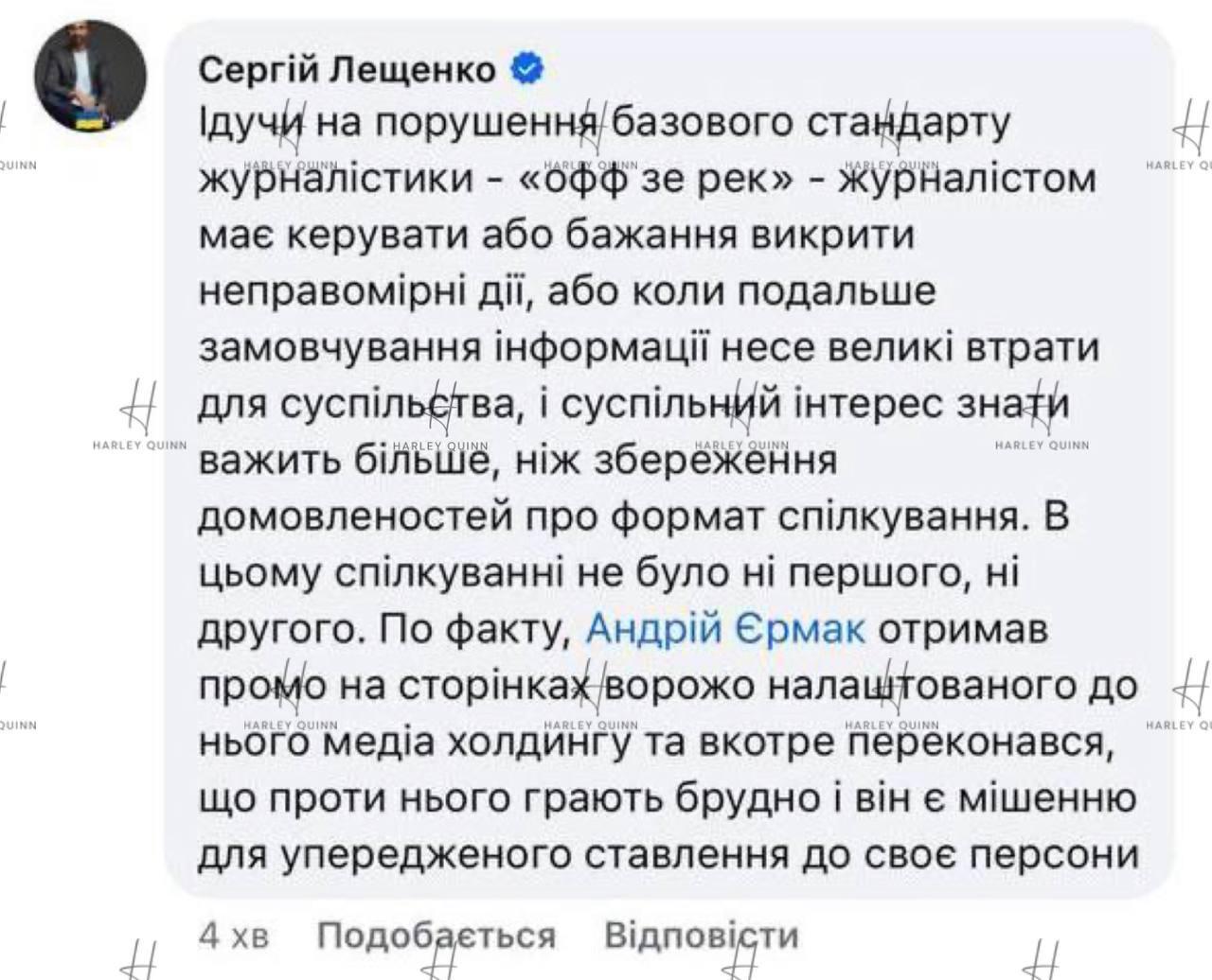 Лещенко стверджує, що захід із Єрмаком був "off the records" (у перекладі "не підлягає розголошенню") - тобто присутні не мали права публікувати цитати спікерів.
