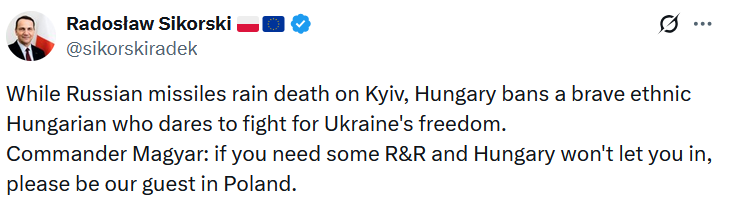 Глава Міністерства закордонних справ Польщі Радослав Сікорський запросив командувача Сил безпілотних систем ЗСУ Роберта Бровді ("Мадьяра") до своєї країни.