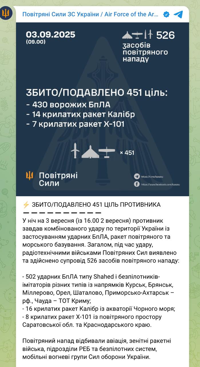 9.11 Україну вночі атакували 502 БПЛА та 24 крилаті ракети, було 72 прильоти, повідомляють Повітряні сили.