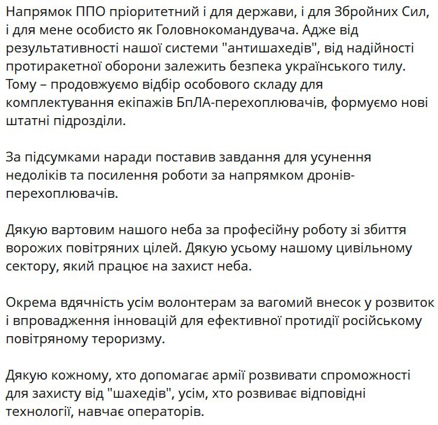 При цьому він заявив про будівництво ешелонованої системи оборони від російських ударних безпілотників та формування нових екіпажів боротьби з дронами.
