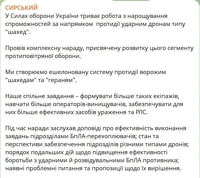 "Поставив завдання щодо усунення недоліків та посилення роботи за направленням дронів-перехоплювачів", - написав головком ЗСУ.