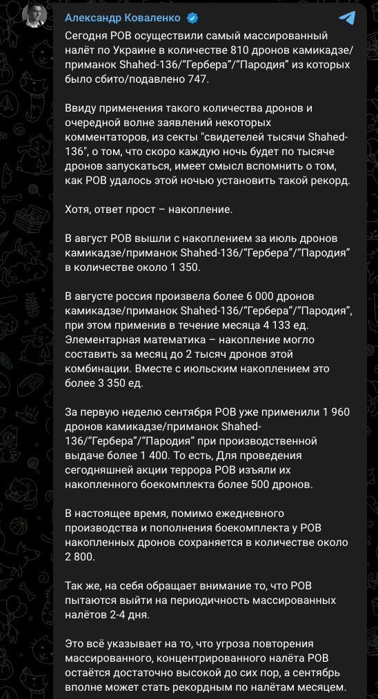 "Це все вказує на те, що загроза повторення масованого, концентрованого нальоту російських військ залишається доволі високою, а вересень цілком може стати рекордним за нальотами місяцем", - написав Коваленко.