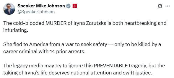 Спікер Палати представників Конгресу США Майк Джонсон висловив глибоку скорботу з приводу холоднокровного вбивства українки Ірини Заруцької.