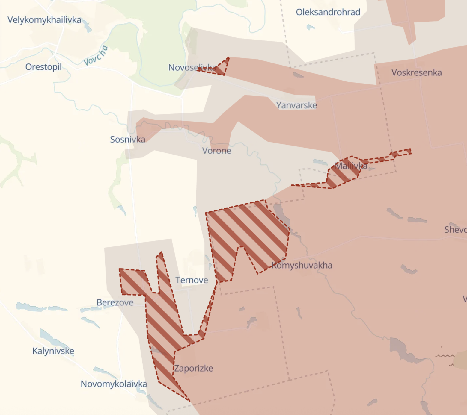 Армія РФ продовжує наступ у Дніпропетровській області, просуваючись відразу на чотирьох дільницях, повідомляє Deep State. Зокрема, росіяни зайшли до Новоселівки, Березового, майже захопили Маліївку та оточили Тернове.