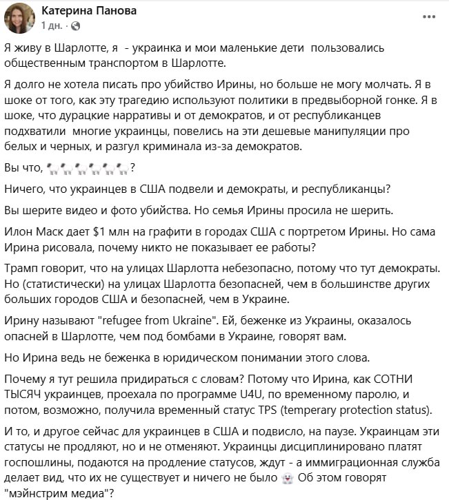 Українські біженці, які приїхали до США за тимчасовою програмою, опинилися у підвішеному стані, повідомила українка Катерина Панова, яка проживає в Шарлотті (саме з цим містом вбили Ірину Заруцьку).