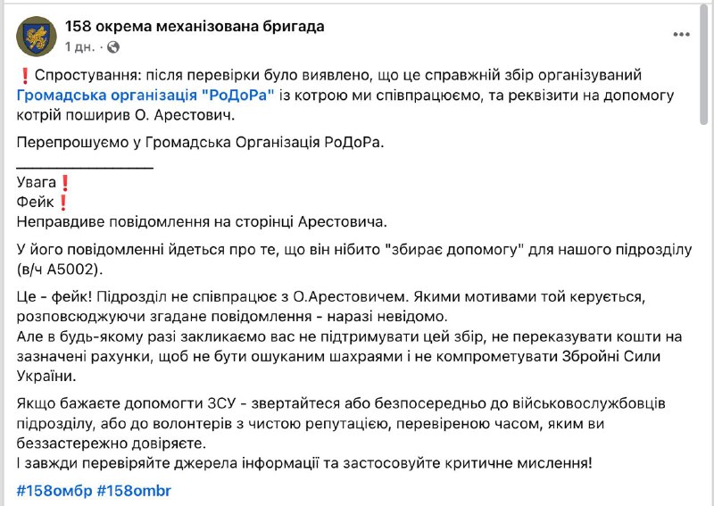 Військові заявили, що після перевірки було виявлено, що оголошений Арештовичем збір справжній, він організований громадською організацією "РоДоРа" (скорочення від "Робимо добро разом"), з якою бригада співпрацює. Автентичними є реквізити для допомоги, які опублікував Арестович.