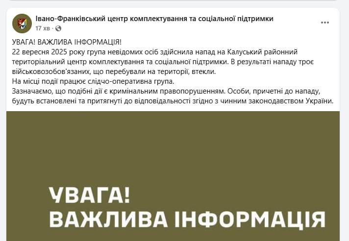У місті Калуш Івано-Франківської області група невідомих здійснила атаку на районний територіальний центр комплектування та соціальної підтримки (ТЦК та СП) та звільнила трьох затриманих.