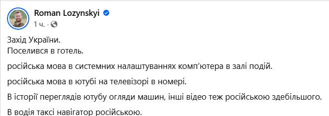 "Захід України. Оселився в готелі. Російська мова в системних налаштуваннях комп'ютера в залі подій. Російська мова в YouTube на телевізорі в номері. В історії переглядів YouTube огляди машин, інші відео теж російською мовою в основному. У водія таксі навігатор російською мовою", - написав нардеп.