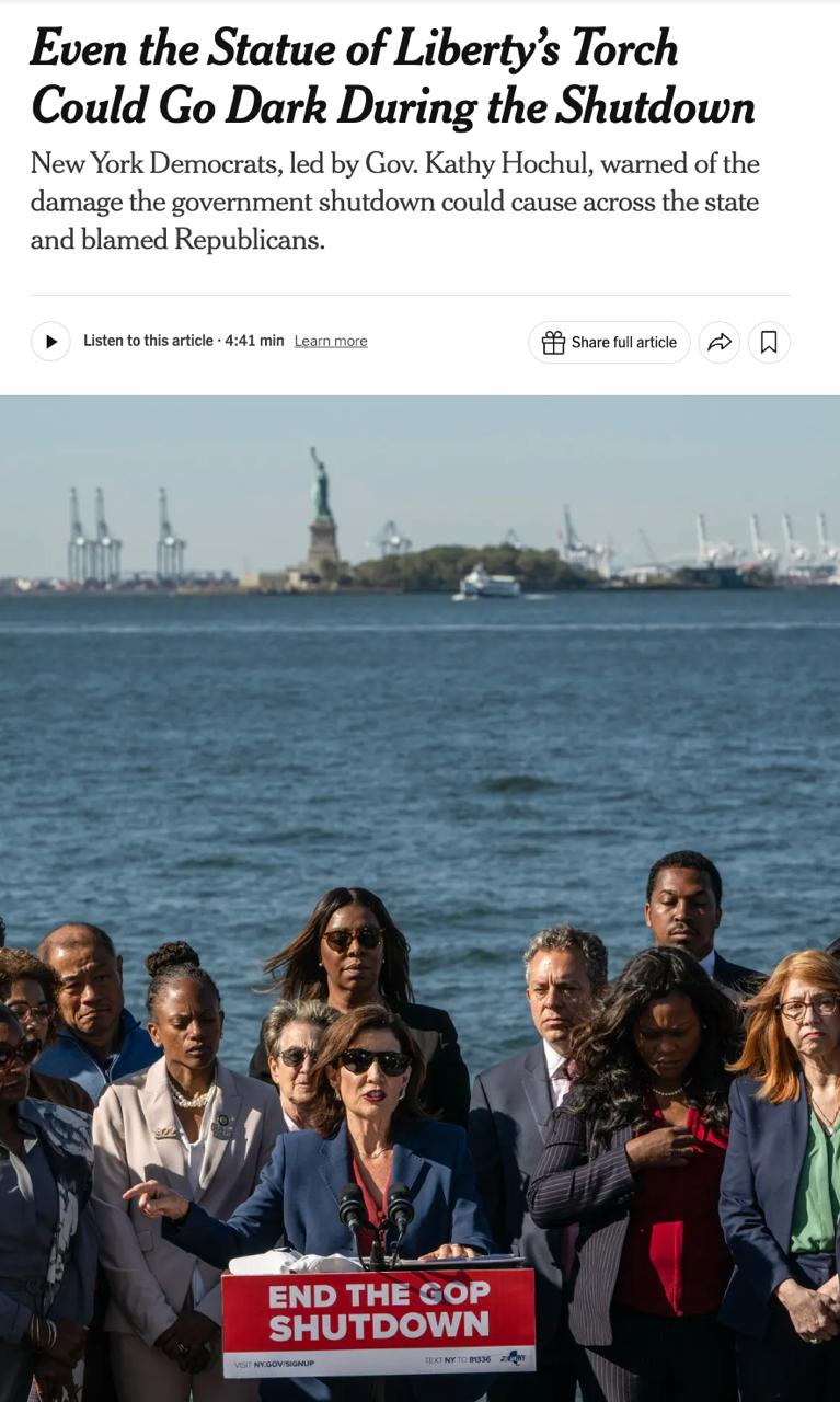 Також губернатор штату Нью-Йорк сказала, що наслідки шатдауну вже починають позначатися по всьому регіону: понад 100 тисяч федеральних службовців були відправлені в неоплачувану відпустку або під загрозою звільнення, включаючи десятки співробітників статуї Свободи; авіадиспетчери та співробітники Управління транспортної безпеки працюють без оплати, а лікарні марно чекають на федеральні відшкодування.