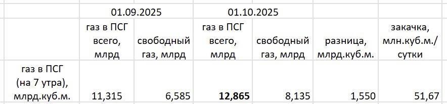 Запаси газу в українських підземних сховищах (ПСГ) на 1 жовтня становили 12,86 мільярда кубометрів, з них вільного газу - 8,135 мільярда кубів.