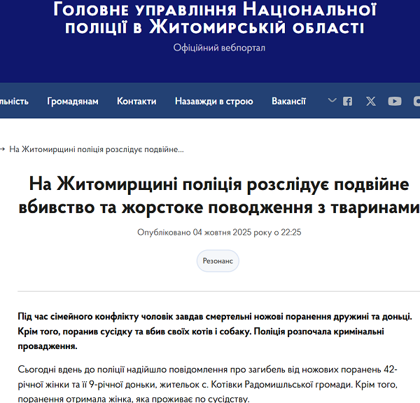 У селі Котівка на Житомирщині чоловік зарізав дружину, дочку, котів та собаку.