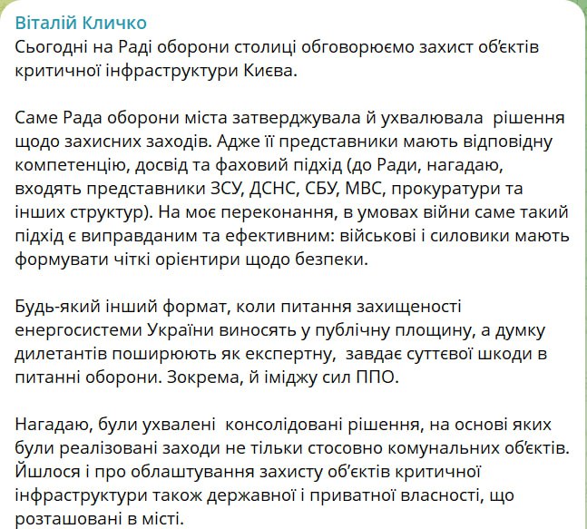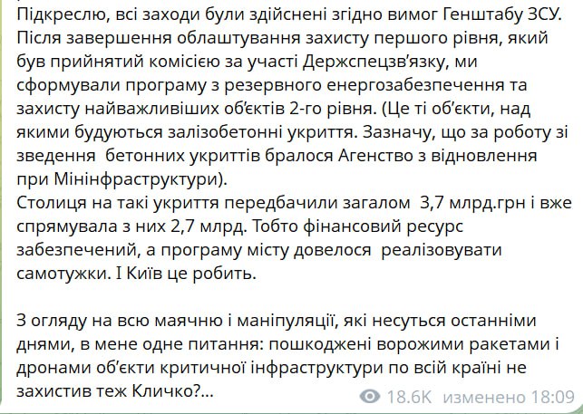 "З огляду на всю марення та маніпуляції, що неслися останніми днями, у мене одне питання: пошкоджені ворожими ракетами та дронами об'єкти критичної інфраструктури по всій країні не захистив також Кличка?" – написав мер Києва.