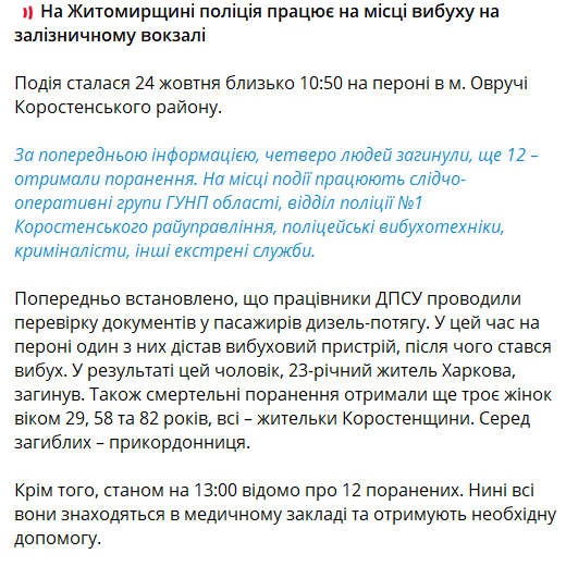 В Овручі на Житомирщині чоловік підірвав гранату в приміському електропоїзді, в результаті загинув сам, а з ним ще троє жінок.