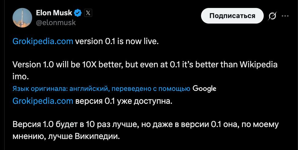 "Версія "Грокіпедії" 0.1 вже доступна. Версія 1.0 буде в 10 разів кращою, але навіть у версії 0.1 вона, на мою думку, краща за "Вікіпедію", - похвалився Маск.