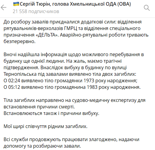 Учора у Хмельницькому пролунав вибух у багатоповерхівці. Вночі під завалами рятувальники знайшли тіла двох людей.