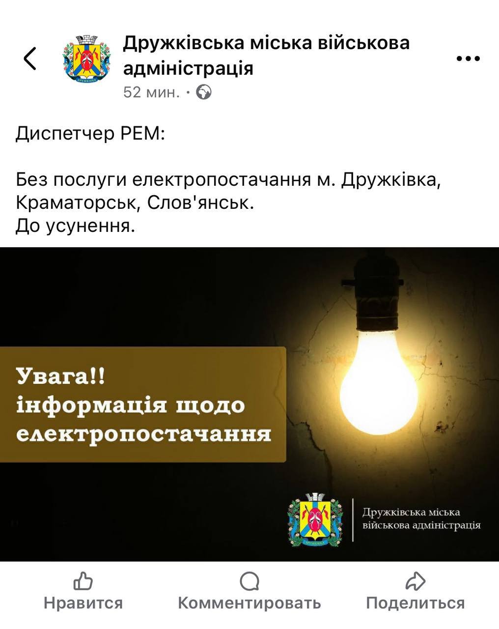 10:12 У районі Слов'янська, Краматорська та Дружківки пропало світло, пишуть місцеві паблики.
