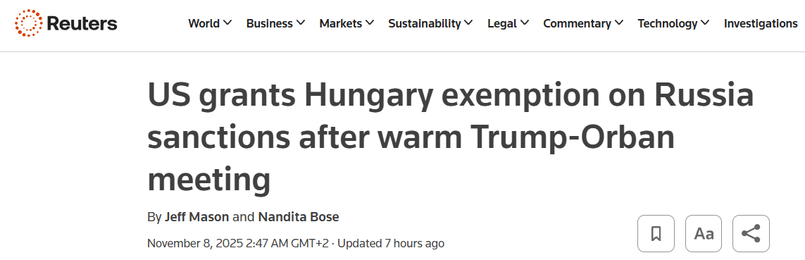 За інформацією співрозмовників Reuters, Угорщині буде надано річний виняток із американських санкцій на російські енергоносії. В обмін країна погодилася придбати скраплений природний газ із США на суму близько 600 мільйонів доларів, а угорський прем'єр також запропонував купити американське ядерне паливо для визволення від вторинних санкцій.