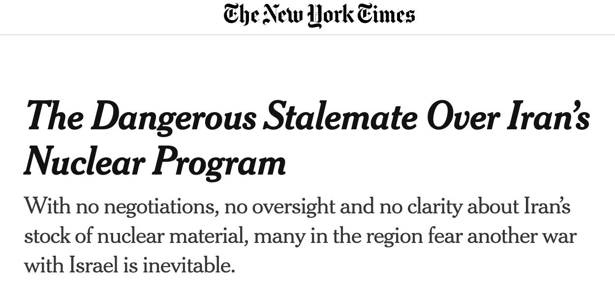 "У результаті створюється небезпечна патова ситуація: немає переговорів, немає певності щодо іранських ядерних арсеналів, немає незалежного нагляду. Багато хто в країнах Перської затоки вважають, що це робить новий напад Ізраїлю на Іран практично неминучим, враховуючи давню думку ізраїльських офіційних осіб про те, що ядерна програма - статті.