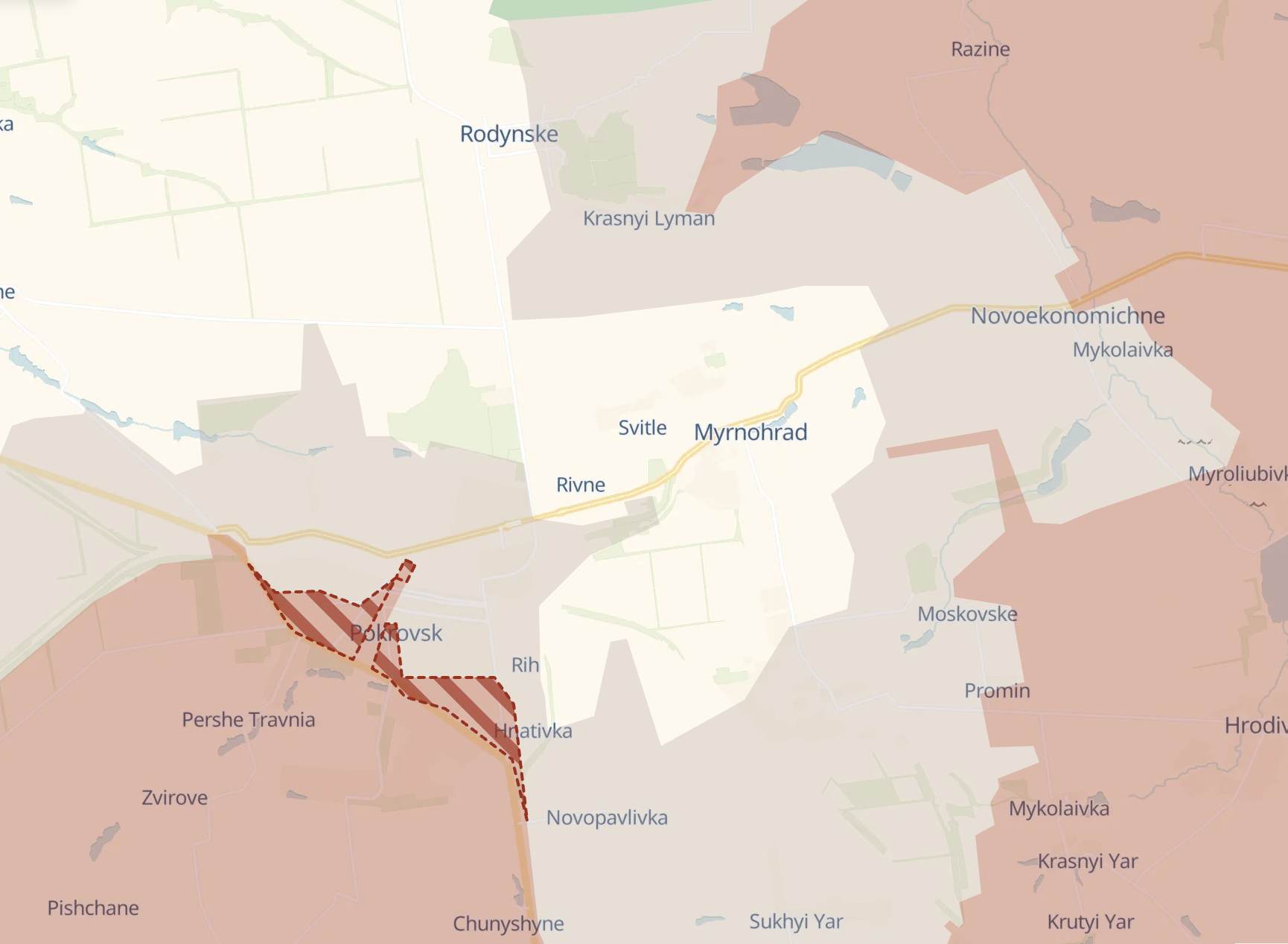 Хоча карта цього не відображає, але Покровська повністю втрачено, заявив український військовий Владислав Потоцький після виходу з міста. Коридор для виходу з цієї ділянки вже менше двох кілометрів.