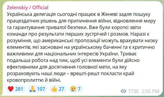 Тим часом президент України Володимир Зеленський заявив, що "після надходження звітів" від української делегації на переговорах у Женеві "є розуміння, що американські пропозиції можуть враховувати низку елементів, що ґрунтуються на українському баченні і є критично важливими для національних інтересів України".