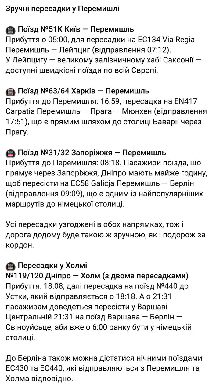 • Потяг №31/32 Запоріжжя - Перемишль. Прибуття до Перемишля: 08:18. Пасажири, що прямують через Запоріжжя та Дніпро, мають майже годину, щоб пересісти на EC58 Galicja Перемишль – Берлін (відправлення о 09:09) – один із найпопулярніших маршрутів до столиці Німеччини.