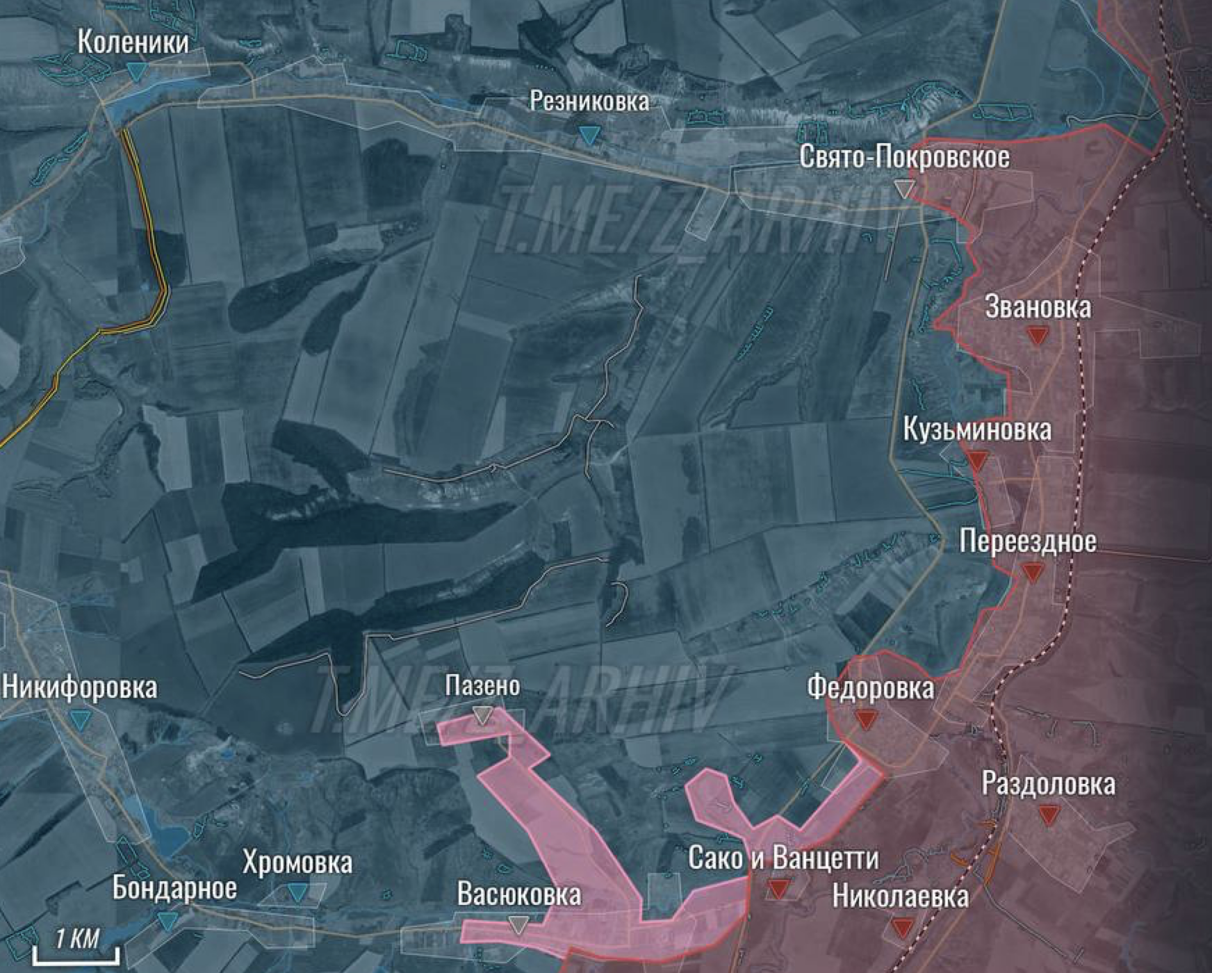 Російські військові паблік також пишуть про динаміку в цьому районі - зокрема, про просування в районі села Пазено, неподалік Привілля.
