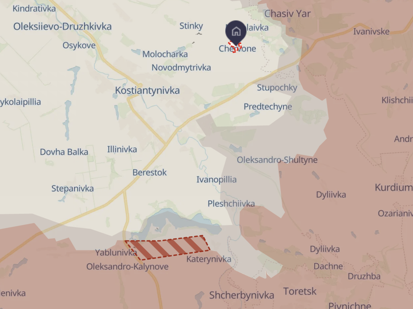 Російське міноборони заявило сьогодні про захоплення села Червоне на північний схід від Костянтинівки. Україна цього не підтверджувала. У перспективі це може виглядати як спроба росіян увійти до міста і в цьому напрямі (зараз вони увійшли до Костянинівки з південного сходу).