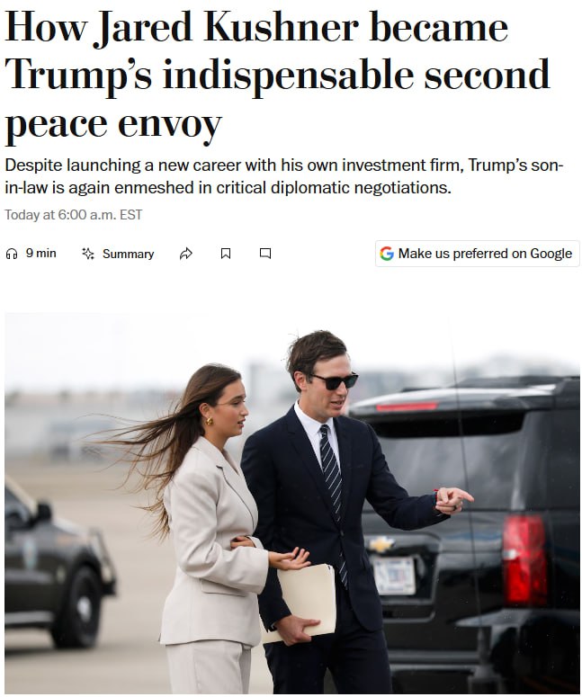 "Трамп натякнув Віткоффу, що Кушнер може приєднатися до нього на зустрічі з Путіним. Одне з джерел повідомило, що сам Віткофф особисто просив Кушнера брати участь у переговорах. План Трампа, складений після обговорень між Віткоффом, Кушнером і російським бізнесменом Кирилом Дмитрієвим, був європейським столиком як Кирило Дмитром капітуляція перед Москвою. У наступні тижні план був частково переглянутий, але Путін на зустрічі з Уїткоффом і Кушнером жорстко наполягав на найважчих для Києва пунктах, включаючи передачу Росії території на сході України», – пише видання.