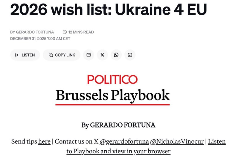 "Закріплення членства в ЄС у мирному плані може виявитися єдиним політично життєздатним способом зрушити це питання з мертвої точки в 2026 році, тим самим перетворюючи його в певному сенсі на найважливіше новорічне рішення Брюсселя", - пише Politico.