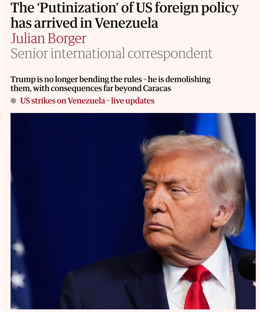 У газеті зазначають, що захоплення президента Венесуели Ніколаса Мадуро спрацювало, і саме це є найтривожнішим сигналом. Успіх операції посилив упевненість Трампа у власній безкарності та відкрив шлях до подальших силових дій задля контролю над територіями та ресурсами.