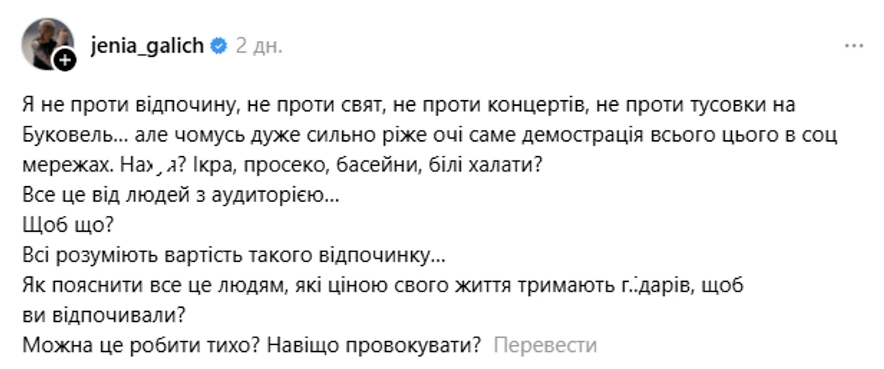 "Я не проти відпочинку, не проти свят, не проти концертів, не проти тусовки в Буковелі, але чомусь дуже сильно ріже очі саме демонстрація всього цього в соціальних мережах. Нах@я? – написав він у Threads.