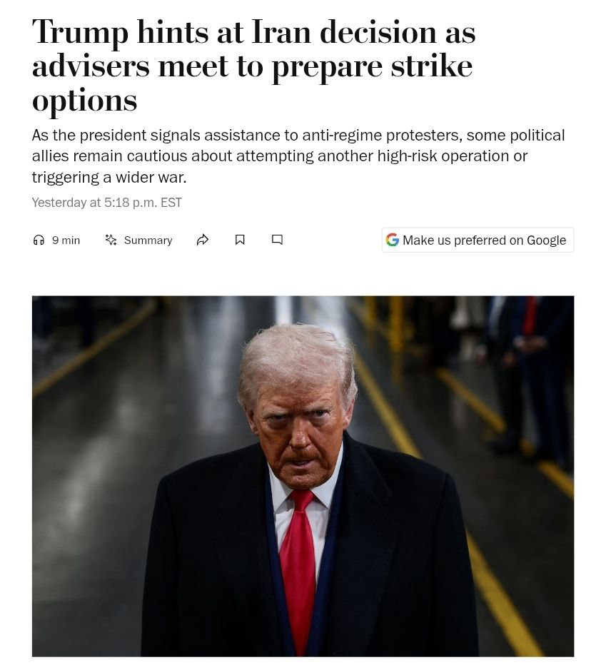 WP вказує, що у вівторок у Білому домі пройшло засідання ради національної безпеки, яка запропонує Трампу варіанти дій щодо Ірану.