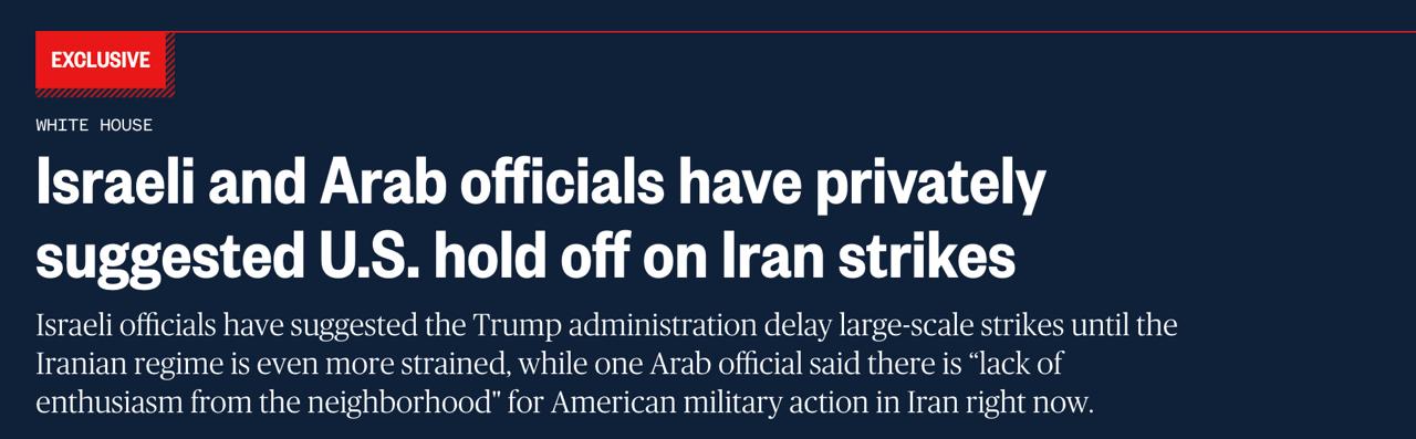 Ізраїльські чиновники запропонували Білому дому відкласти великомасштабні удари доти, доки іранський режим не опиниться у ще більш напруженому становищі через протести. Вони заявили, що повністю підтримують зміну режиму в Тегерані та зусилля США щодо цього, але стурбовані, що зовнішнє військове втручання в даний момент може перешкодити протестувальникам.