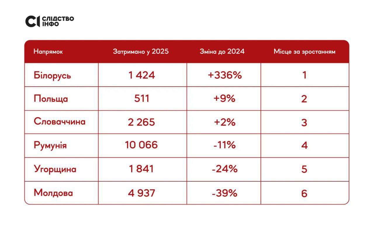 Нагадаємо, за даними Держприкордонслужби, в Україні в 2025 році понад 13 тисяч чоловіків було затримано під час спроби незаконного перетину кордону. Найчастіше їх затримували на кордоні з Євросоюзом, проте близько 1400 людей намагалися незаконно потрапити до Білорусі.