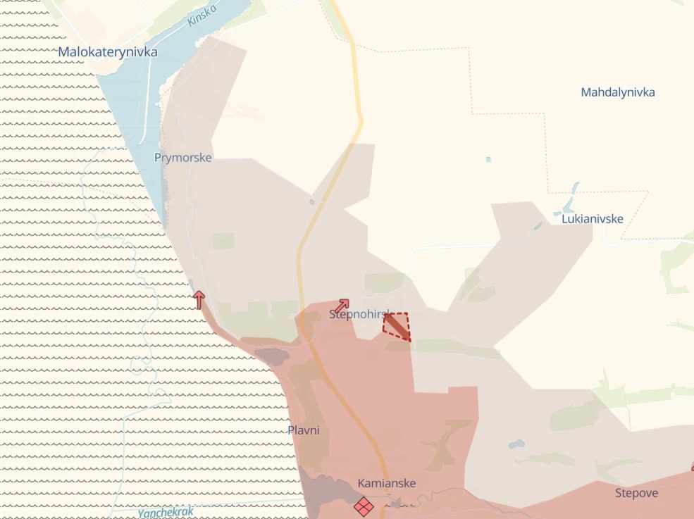 Російські військові вже просочуються на північ, до села Приморське, де щільна приватна забудова та відносно незначні руйнування створюють умови для прихованого пересування, що сприяє формуванню значної "сірої зони".
