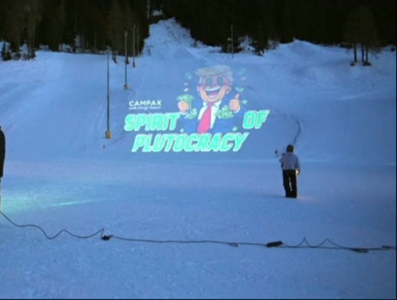 Тим часом у Давосі проходять антитрампівські акції. Рух Campax спроектував на гірськолижні схили елітного курорту сатиричне зображення президента США за підписом "Дух плутократії" (плутократія - форма правління, за якої влада належить багатим) та гасло "Без королів" (No Kings, девіз протестів проти Трампа, організованих у США ). У Campax заявили, що акція "символізує розрив між владою та суспільством".