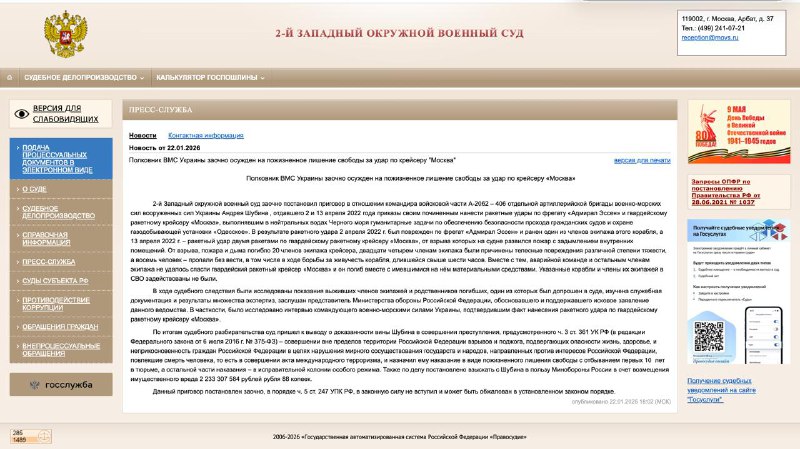 "Медіазона" пише, що 2-й Західний окружний військовий суд, розташований у Москві, нещодавно виніс вирок у справі про затоплення крейсера. До довічного терміну заочно засудили командира 406 артилерійської бригади ВМС України Андрія Шубіна, який, за версією російського слідства, наказав завдати ракетних ударів по крейсеру "Москва" і фрегату "Адмірал Ессен".