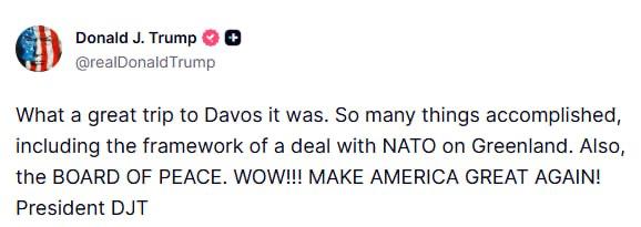 "Яка чудова поїздка в Давос вийшла. Вдалося досягти багато чого, включаючи рамки угоди з НАТО про Гренландію. А також Рада світу. Вау! Зробимо Америку знову великою!" – написав американський президент.