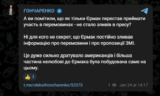 "А ви помітили, що як тільки Єрмак перестав брати участь у переговорах – не стало зливів у пресу? Ні для кого не секрет, що Єрмак постійно зливав інформацію про переговори та пропозиції ЗМІ. Це дуже сильно дратувало американців і більша частина нелюбові до Єрмака була побудована саме на цьому", - пише у своєму телеграм-каналі.