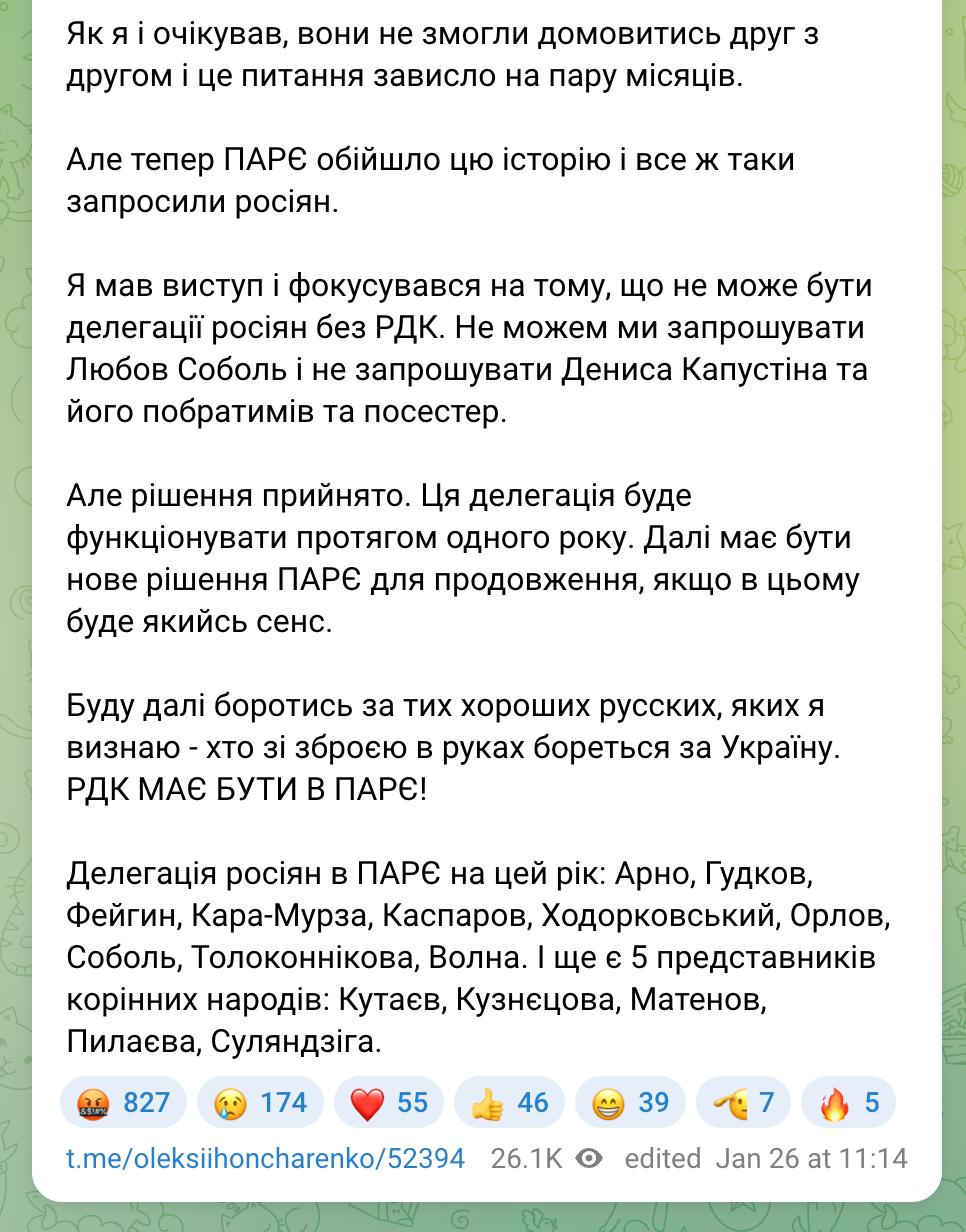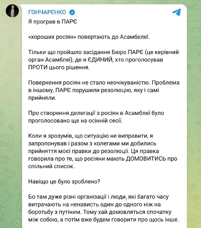 Гончаренко повідомив, що на засіданні керівного органу асамблеї, Бюро ПАРЄ, був єдиним, хто голосував проти запрошення росіян. Коли він зрозумів, що це неминуче, то вимагає включити до складу делегації представника "Русского добровольческого корпуса", який воює у складі ЗСУ. У підсумку до делегації, яка отримала мандат на один рік, увійшли: