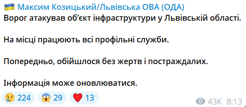 Про це повідомив голова Львівської обласної військової адміністрації Максим Козицький у своєму Telegram-каналі.