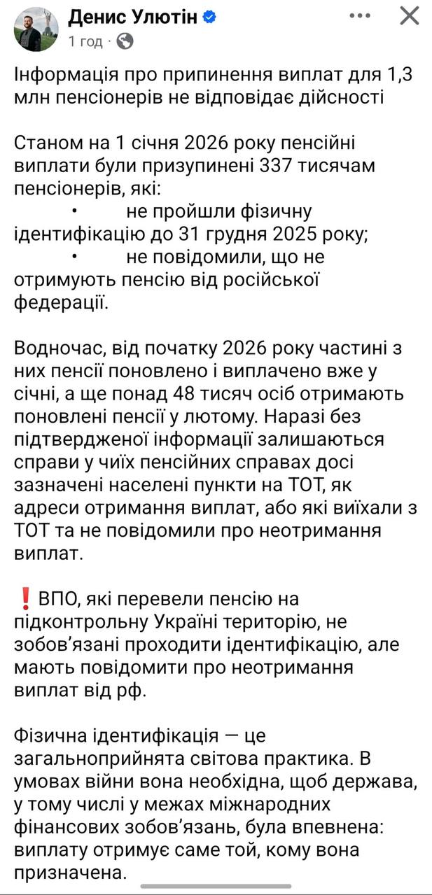 Міністр соціальної політики Денис Улютін спростовує інформацію омбудсмена Дмитра Лубінця про припинення виплат для 1,3 мільйонів пенсіонерів. Проте підтвердив, що виплати зупинено понад 330 тисячам пенсіонерів.