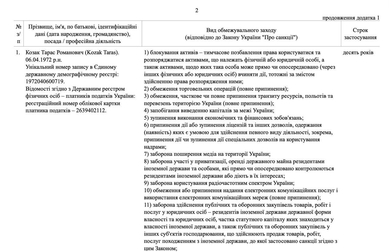 Крім Фірташа, Зеленський також продовжив санкції проти колишнього народного депутата Тараса Козака (соратника Віктора Медведчука).