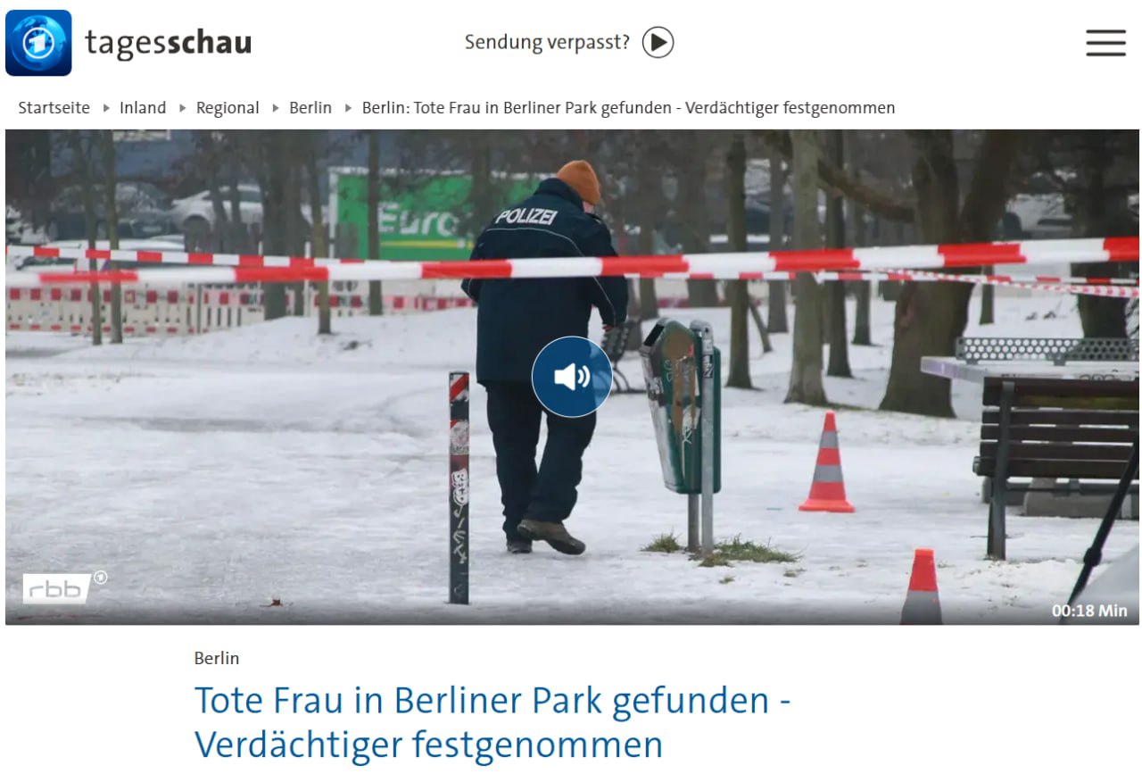 За інформацією видання, 9 лютого біля дитячого майданчика у парку Берліна виявили закривавлене тіло жінки – вона померла від травм верхньої частини тіла.