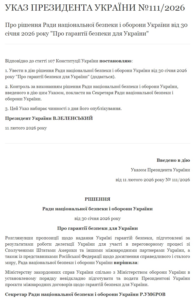 Володимир Зеленський підписав указ, яким набрав чинності рішення Ради національної безпеки і оборони України від 30 січня "Про гарантії безпеки для України". У цьому рішенні РНБО доручає Міністерству закордонних справ та Міністерству оборони підготувати проекти міжнародних договорів щодо гарантій безпеки для України.
