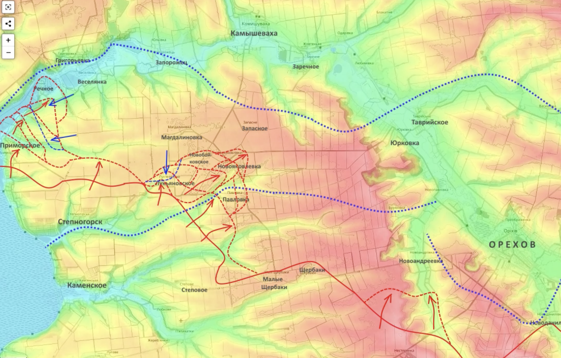 На південь від Запоріжжя ЗСУ, за даними пабліків РФ, контратакують у районі Лук'янівського та Приморського, де нещодавно наступали росіяни.