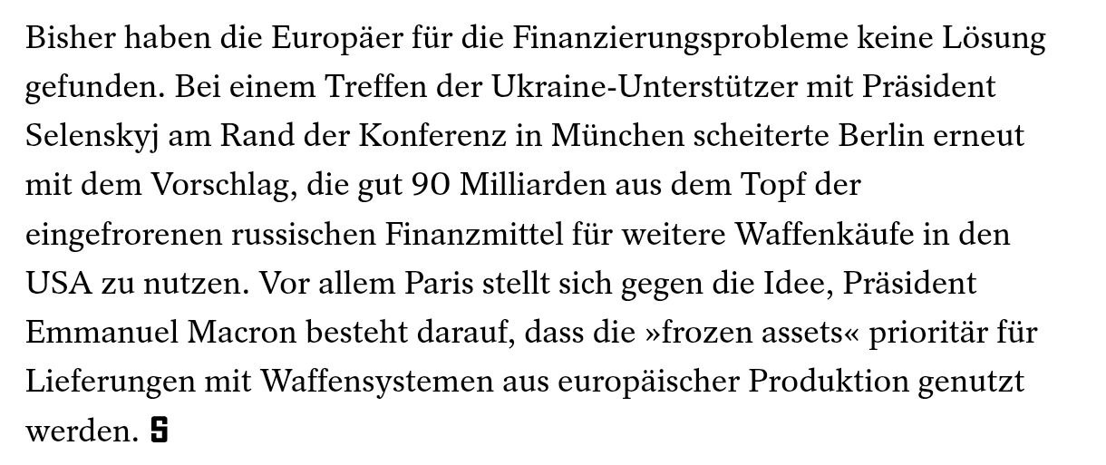 "Пропозиція Берліна використати понад 90 мільярдів євро із заморожених російських активів для подальших закупівель озброєнь у США в черговий раз провалилася. Париж, зокрема, виступає проти цієї ідеї; президент Еммануель Макрон наполягає на тому, щоб заморожені активи використовувалися в першу чергу для постачання систем озброєння, вироблених у Європі", - йдеться у повідомленні.